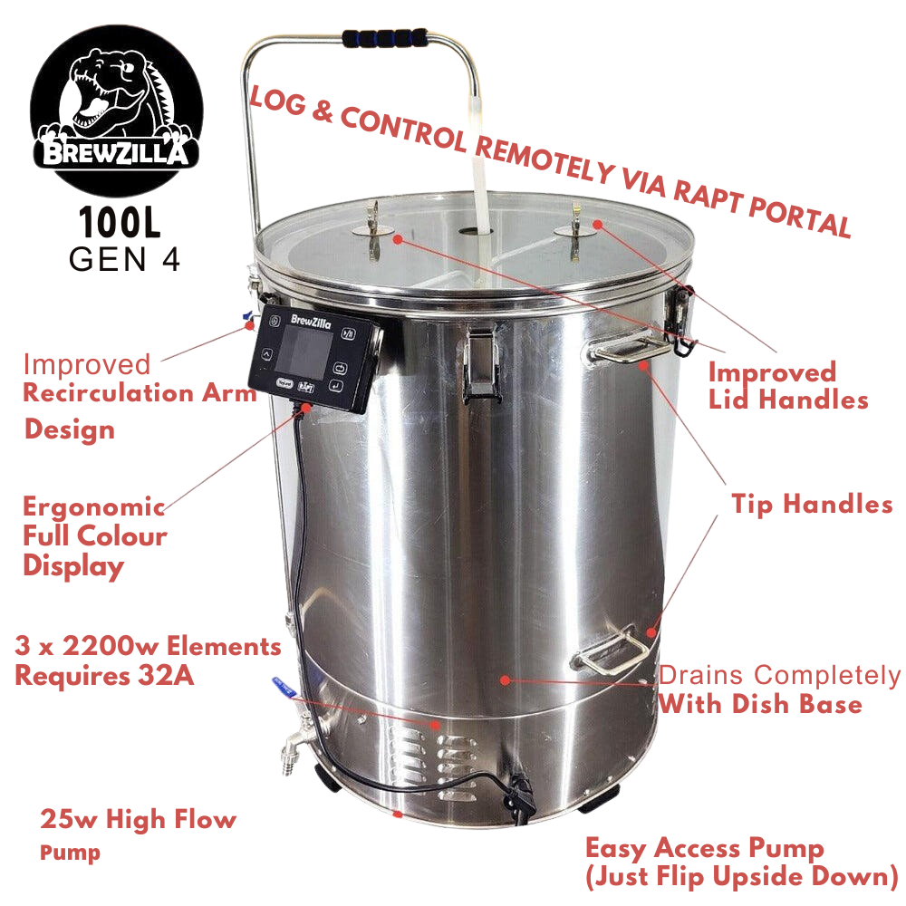 BrewZilla Gen 4 100L er designet for å være et kompakt enkeltkarssystem for hjemmebrygging med hele 6600W, som kan brukes rett ut av boksen med en 32A 3-fase 400V kontakt. Med kapasitet for å lage batcher opp til 90L er dette det største kompaktbryggeriet levert av KegLand!