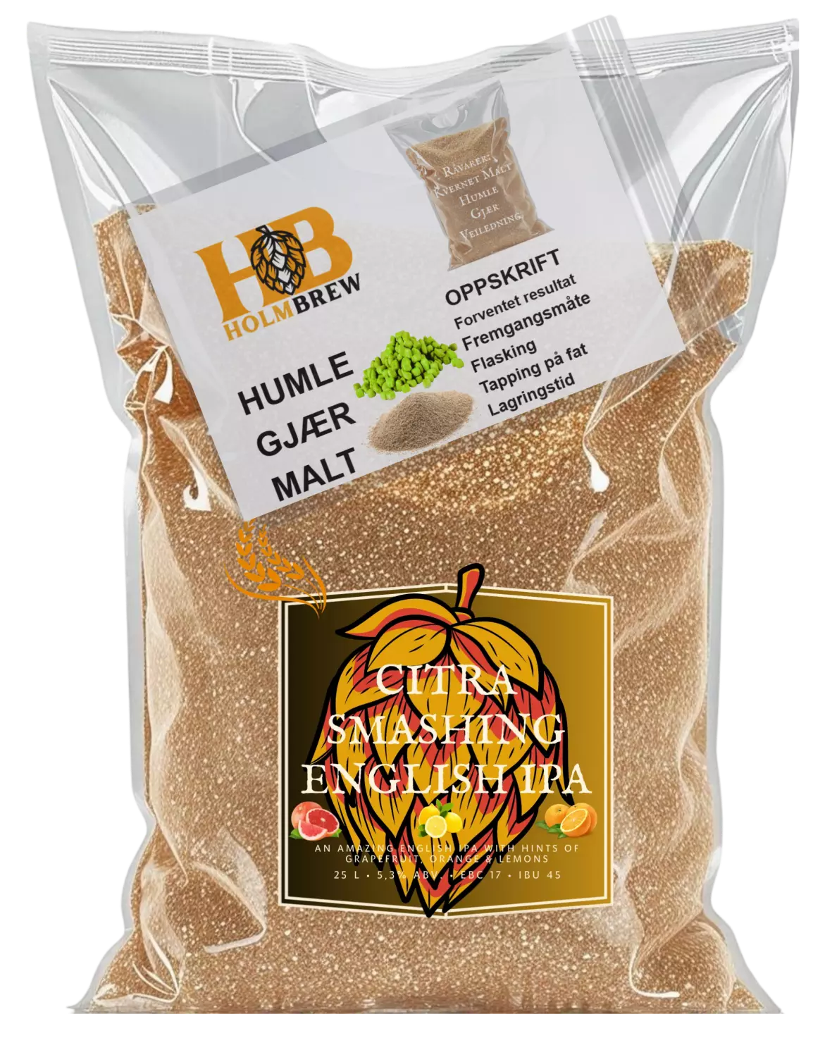 Dette settet er satt sammen av oss i Holm Brew for å gi hjemmebryggeren de beste forutsetningene for et vellykket resultat. Pakken inneholder nøye utvalgte ingredienser av høy kvalitet, ferdig oppmålt knust malt, humle og gjær for produksjon av 25 liter vørter.
